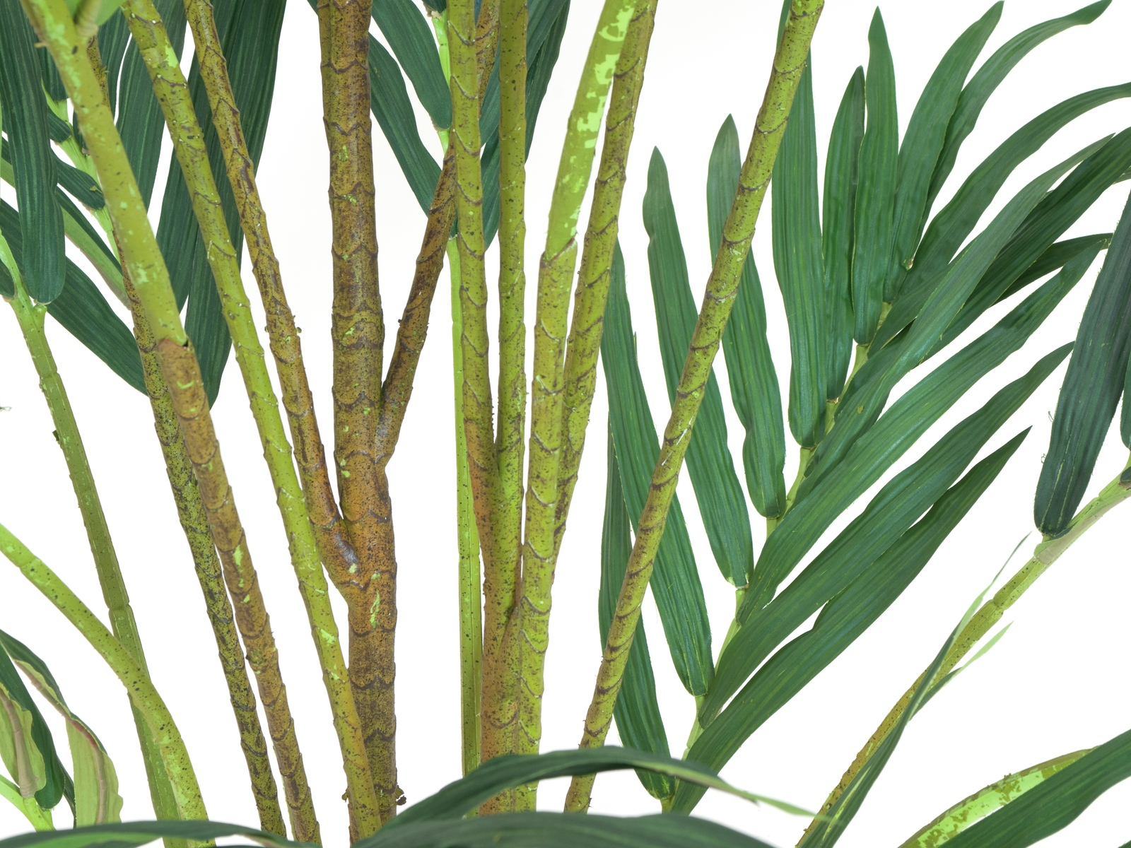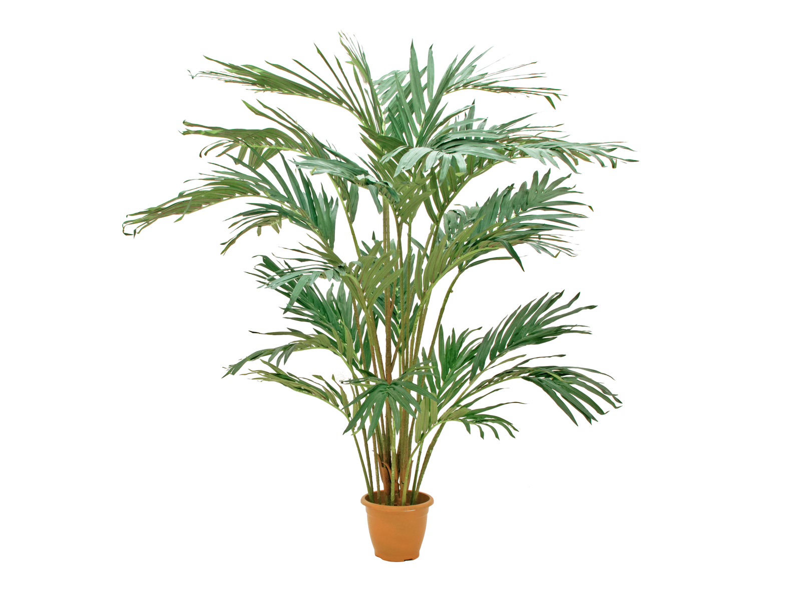 Die formschöne kanarische Dattelpalme von Europalms wurde bereits ab Werk mit schwer entflammbaren Blättern ausgestattet. Deshalb eignet sie sich besonders gut für einen Einsatzort, bei dem gemäß Brandschutzverordnung DIN 4102/B1 gefordert ist. Dies sind zum Beispiel öffentliche Einrichtungen wie Behörden, Krankenhäuser, Seniorenheime, aber auch Veranstaltungshallen oder Messestände.Zusätzlich empfehlen wir, den Flammschutz mit einem entsprechendem Spray nach DIN 4102/B1 in regelmäßigen Abständen aufzufrischen.Die ausladenden Blätter beginnen bereits im unteren Pflanzenbereich und verleihen der Palme ihr üppiges Erscheinungsbild.Die Kunstpflanze hat eine Gesamthöhe von ca. 240 cm und ist zur Stabilisierung fest in einem Kunststoff-Übertopf in Terracotta-Optik eingepflanzt.
