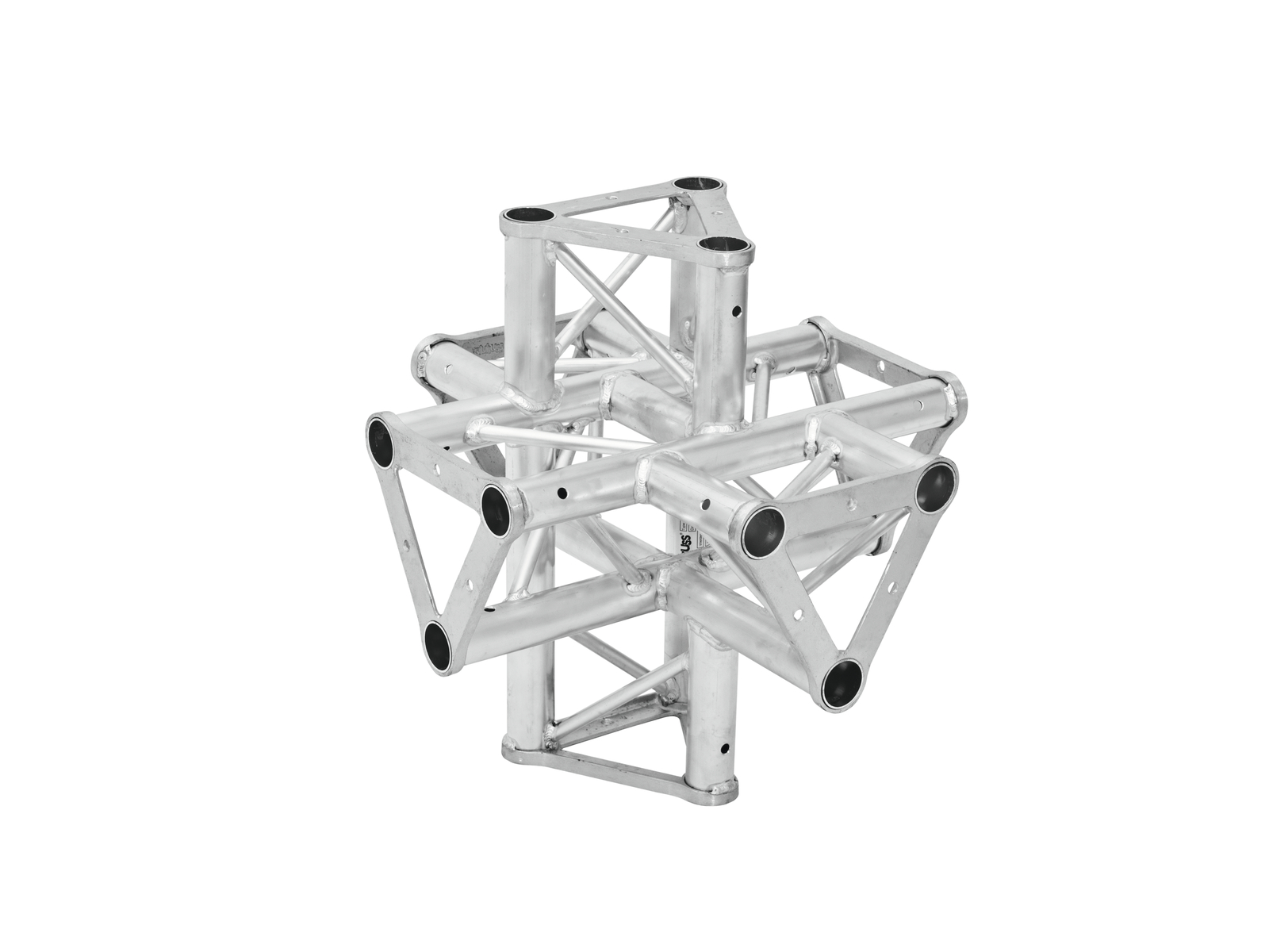 TRISYSTEM 3-Punkt TraversensystemBeim TRISYSTEM handelt es sich um ein 3-Punkt Traversensystem mit Druckguss-Kopfplatten, die über drei Steckhülsen mit je zwei M8 Schrauben/Muttern verbunden werden.Die drei Gurtrohre sind aus 50 mm Aluminiumrohr mit 2 mm Wandstärke gefertigt und geben diesem System ein hervorragendes Gewichts-Belastbarkeitsverhältnis. Die Streben haben einen Durchmesser von 16 mm bei 2 mm Wandstärke und lassen viel Spiel zum Einhängen von Couplern, Haken und Schellen.Mit Außenmaßen von 263 mm bzw. 238 mm handelt es sich immer noch um ein relativ kompaktes System höherer Belastbarkeit, das die Installation nicht allzu wuchtig erscheinen lässt.Das TRISYSTEM wurde primär für permanente Installationen im Ladenbau, für Diskotheken- und Theatereinrichtungen konzipiert.Durch die Verwendung der optionalen Schnellverschlüsse lässt sich dieses System jedoch genauso gut im Messebau und in der Veranstaltungstechnik einsetzen.Alles in allem ein universell einsetzbares Traversensystem, das durch sein umfangreiches Sortiment an Standard-Systemlängen, Ecken und Zubehör zu punkten versteht.